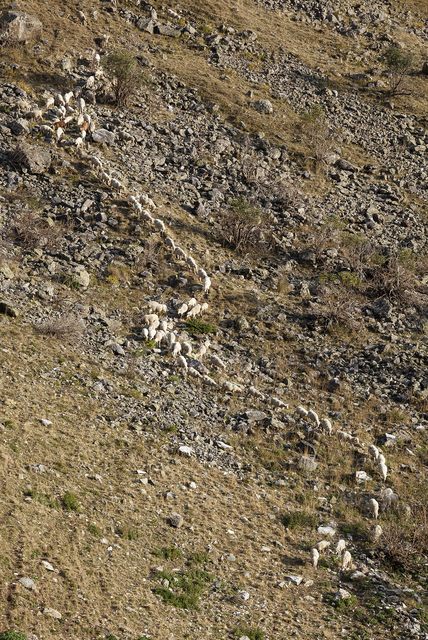 Chameaux broutant près d’une rivière gelée entourée de montagnes et d’arbres