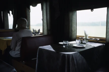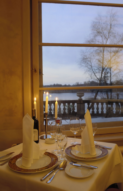 Dîner élégant près de la fenêtre avec vue sur le lac