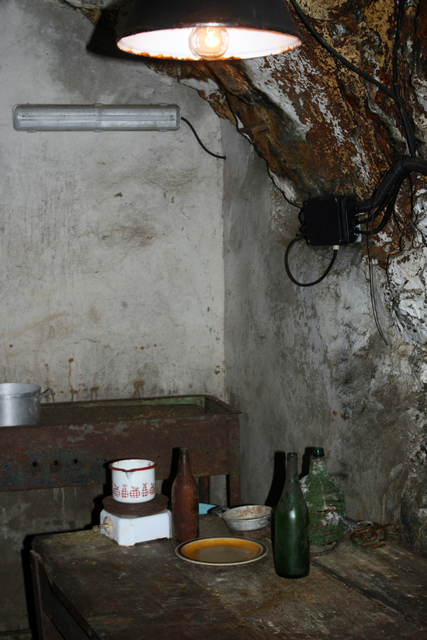 Ancienne cuisine rustique avec évier en pierre sous une fenêtre