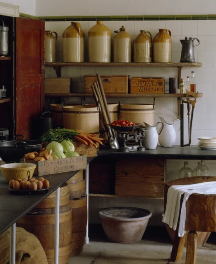 Cuisine rustique avec légumes et ustensiles anciens