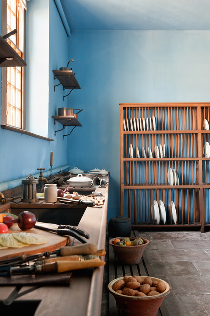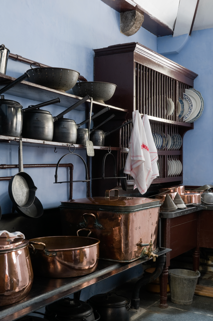 Intérieur de cuisine ancienne avec équipements en cuivre et étagères