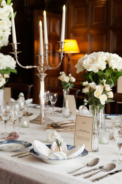 Dîner élégant avec chandeliers et fleurs blanches