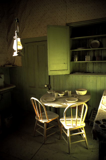 Cuisine abandonnée avec table et chaises en bois