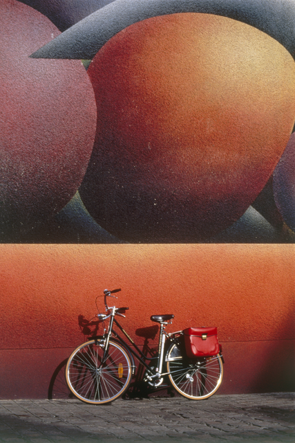 Bicyclette avec grappes d’oignons devant une vitrine bleue