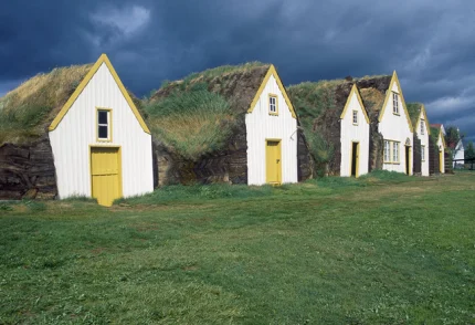 Maisons traditionnelles au toit en herbe sous un ciel orageux