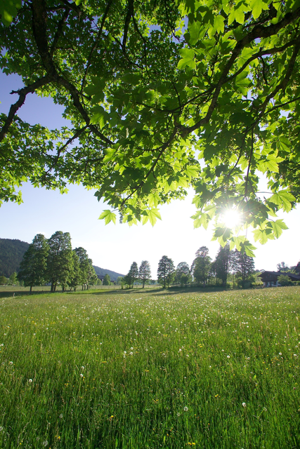 Champ ensoleillé avec feuillage vert
