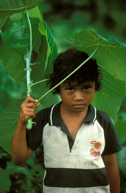 Enfant tenant une grande feuille dans une forêt dense.