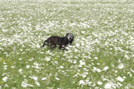 Chien noir dans un champ de fleurs blanches