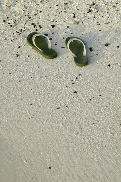 Tongs vertes sur le sable blanc