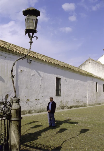 Homme en tenue traditionnelle devant une porte bleue