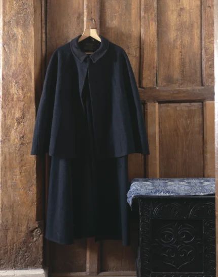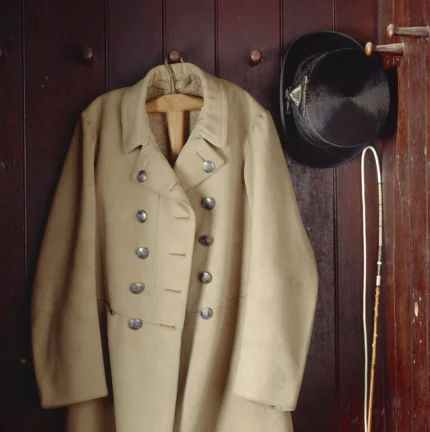 Manteau militaire beige suspendu à une porte en bois avec un chapeau noir