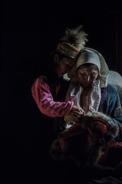 Mère et fille en costume traditionnel brodant