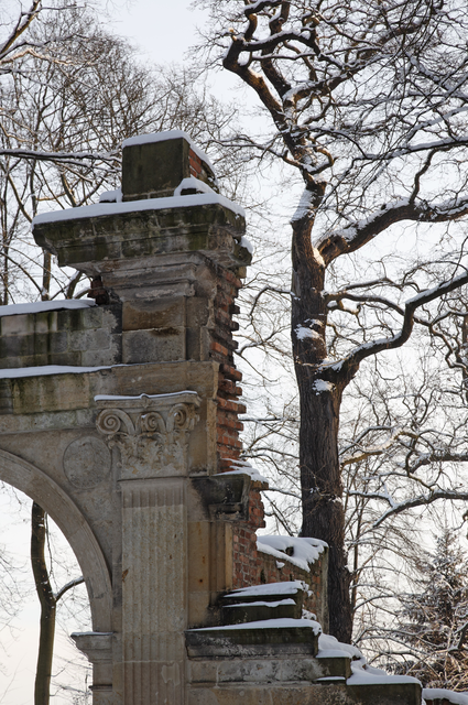 Vieille arche enneigée avec arbres en hiver