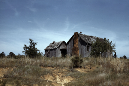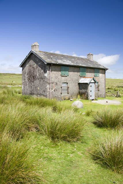 Ferme abandonnée dans les prairies verdoyantes sous un ciel bleu