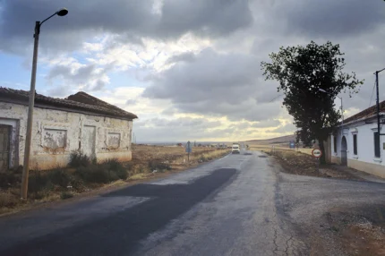 Maison abandonnée en bord de route sous un ciel nuageux