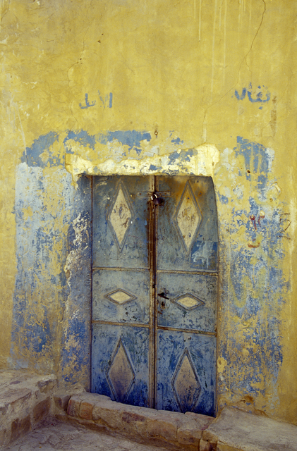 Porte verte sur mur bleu avec caisse en bois