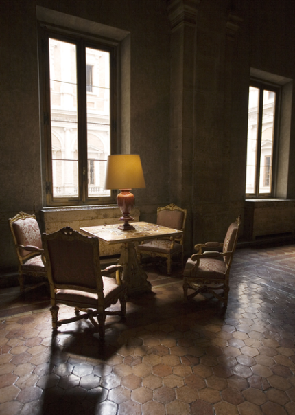 Coin de lecture avec lampe et quatre chaises anciennes près de fenêtres