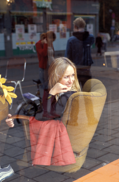Jeune femme assise dans un café devant une fenêtre