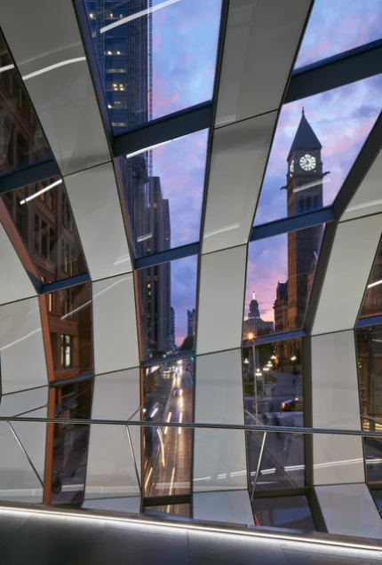Vue à travers les vitres modernes sur une ville au crépuscule