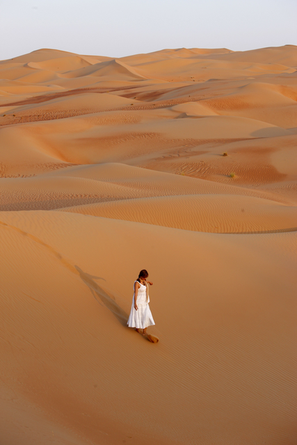 Femme marchant dans le désert au coucher du soleil