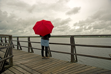 Personne avec parapluie rouge sur pont en bois au bord du lac