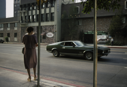 Femme en robe attend à un passage piéton, voiture verte passant
