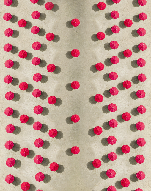 Alignement de parasols rouges sur une plage de sable