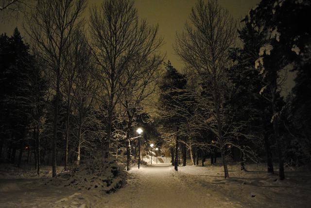 Allée boisée enneigée éclairée la nuit