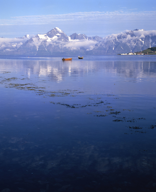 Barques sur un lac avec montagnes enneigées