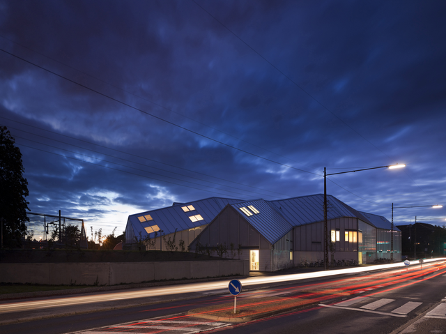 Bâtiment industriel moderne éclairé au crépuscule