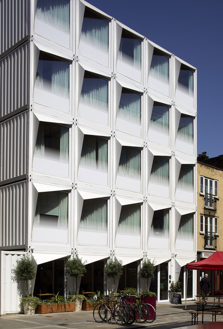 Mots-clés : architecture, bâtiment, bicyclette, blanc, cafétéria, carré, conteneurs, design, extérieur, fenêtres, métal, moderne, plantes, rues, soleil, structure, urbain, verre