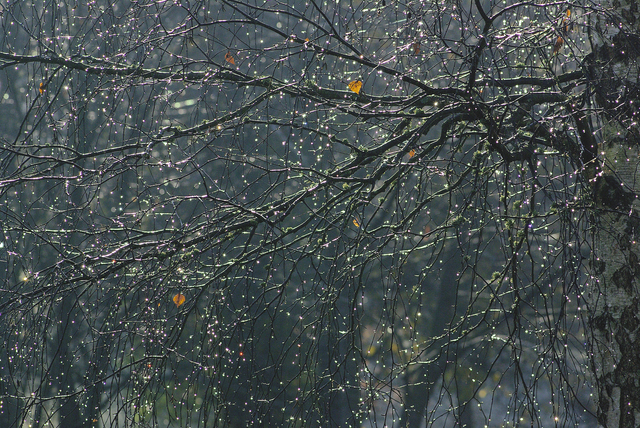 Branches d’arbres avec gouttes de rosée brillantes au soleil