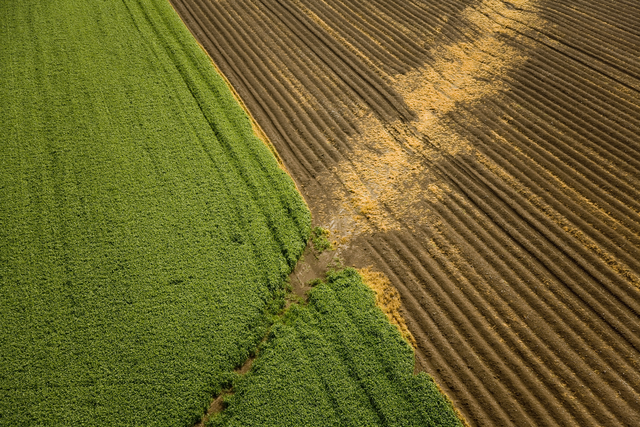 Champ divisé entre cultures vertes et sol nu vu du ciel.