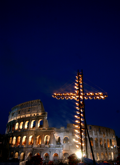 Colisée de Rome et croix éclairée la nuit