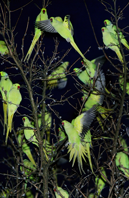 Perruches Vertes dans un Arbre la Nuit