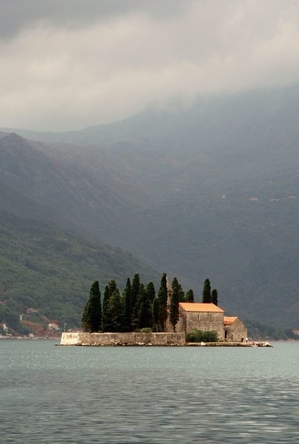 Île avec église et cyprès sur fond de montagne