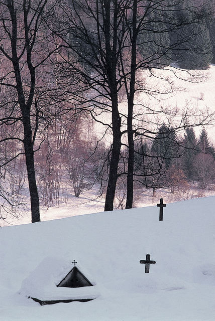 Tombes couvertes de neige dans une forêt