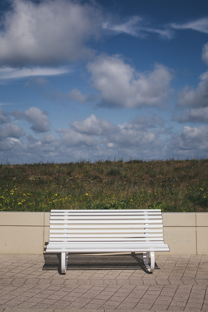 Banc blanc sous un ciel nuageux