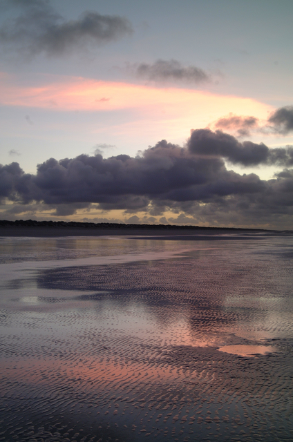 Coucher de soleil sur une plage déserte avec ciel nuageux