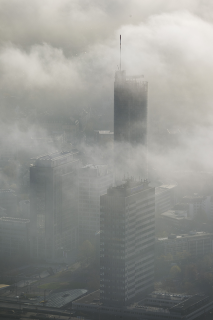 Tours d’immeubles enveloppées de brouillard dans une ville
