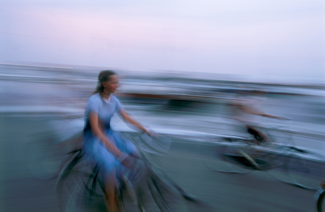Cyclistes flous près de la mer au crépuscule