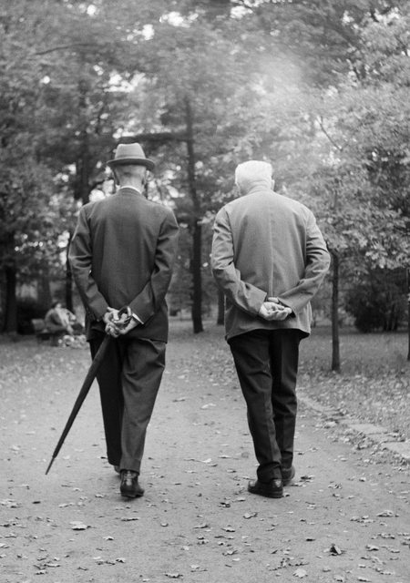 Deux hommes âgés se promenant dans un parc