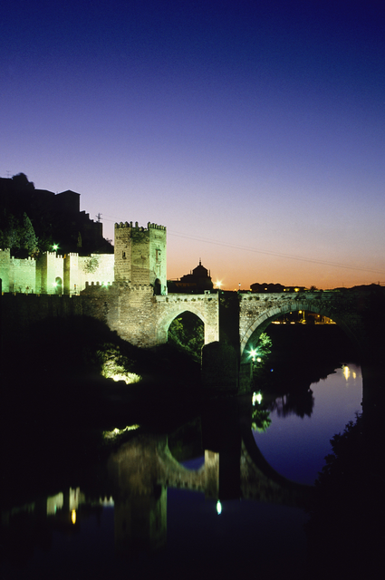 Pont médiéval illuminé au crépuscule