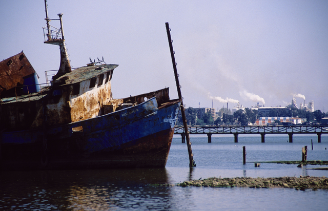 Épave de bateau rouillé près d’une usine