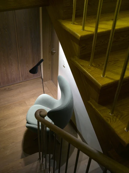 Coin de lecture sous un escalier en bois