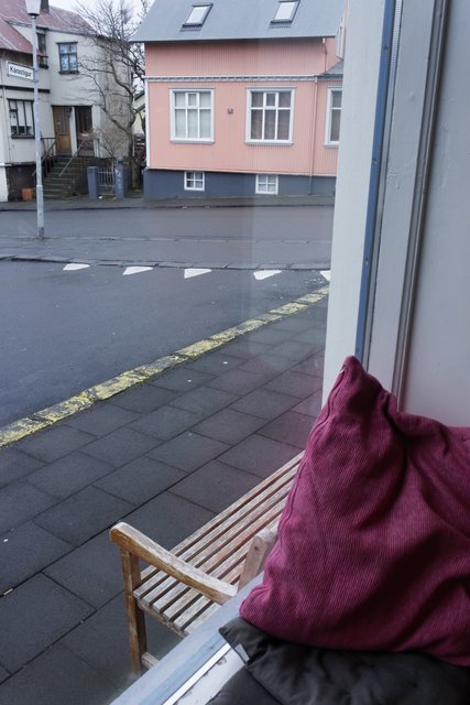 Vue d’une fenêtre à Reykjavik avec des coussins colorés