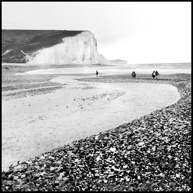 Falaises blanches et plage de galets en noir et blanc