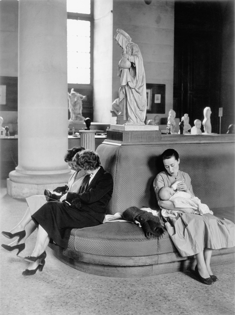Femmes assises autour d’une statue dans un musée.