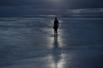 Silhouette solitaire face à la mer sous un ciel dramatique