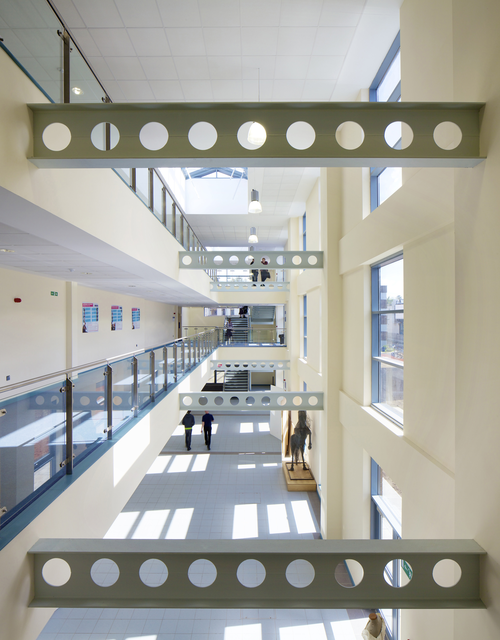 Intérieur de bâtiment moderne avec passerelles et structures en acier
